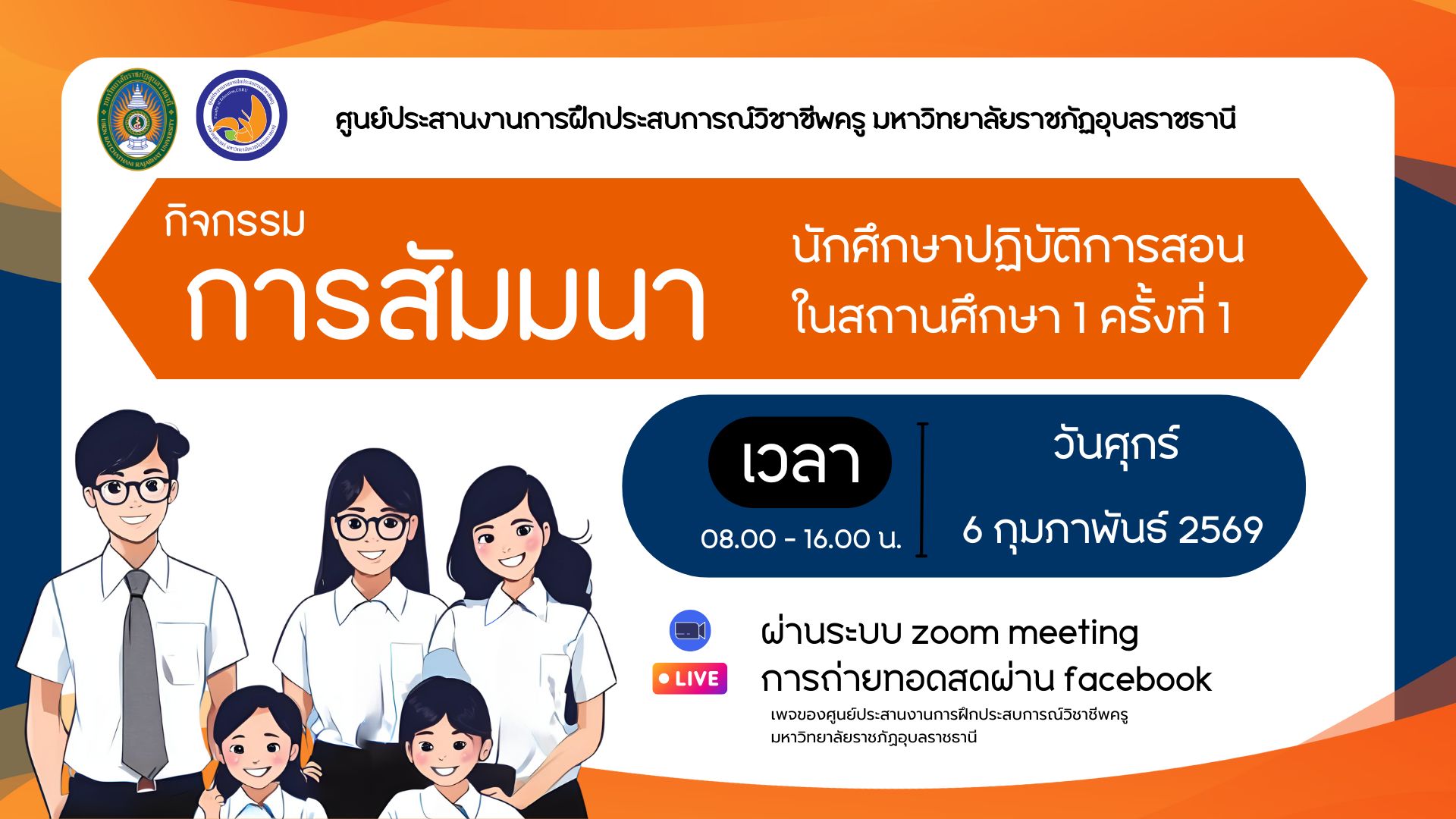ถ่ายทอดสดผ่าน Facebook เพจศูนย์ประสานงานการฝึกประสบการณ์วิชาชีพครู มหาวิทยาลัยราชภัฏอุบลราชธานี